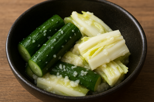 野菜に塩麹を揉み込んで冷蔵庫で一晩。簡単に深みのある発酵漬物が完成します。